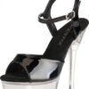 Adorable stiletto heel with a front platform rise. Features a metallic chrome design with an adjustable strap for secure fit. Heel height 7 inches.