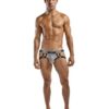 Low rise thong, elasticized concealed fly, easy access clip pouch, plush elastic branded waistband, color coordinating trim. Sheer shadow stripe tone on tone nylon fabric, spandex trim. Plush elastic branded, logo'd waistband. Fabric content 93% Nylon, 7% Spandex. From Male Power Underwear. Color Black, Blue. Men sizes small to medium, S/M. Waist 28 inches to 34 inches.