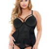 Corset Black OS from Coquette International lingerie line. Set includes camisole top, g-string panty, cuffs and garter. Hook and eye front closure. Cuffs with bow details. Color Black. Materials Stretch Lace. Ladies one size fits most. Dress sizes 6 to 12.