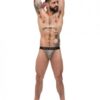 Diamond Mesh Bong Thong By Male Power. Sheer stretch mesh fabric with diamond shaped panes throughout. Rich Navy Blue color with coordinating branded printed waistband. S/M. Waist: 28in.-34in.