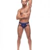 Diamond Mesh Ring Jock. By Male Power. Sheer stretch mesh fabric with diamond shaped panes throughout. Rich Navy Blue color with coordinating branded printed waistband. Ring jock features plush elastic butt boosting leg bands, and nickel-plated rings. S/M. Waist: 28in.-34in.