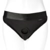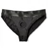 Features high cut style waist band. Interior fabric panels secure toys and provide support. Built in nitrile o-ring 1.5 inches. Designed with 2 bullet pockets to provide extra stimulation. Wicking material keeps moisture under control. Includes a travel pouch to carry your harness anywhere with ease. Men size extra large, XL. Waist band 31 inches to 34 inches. Materials Nylon, Polyester, Spandex.