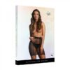 Mini dress with short sleeves. Made of two different net materials, small fence net and fishnet, with dividing opaque stripes between two fabrics. This dress has a lot of stretch and can be worn from size XL to 4XL. Thong not included. Hand wash or hand wash programme, cold water, dry flat, do not tumble dry, do not iron.